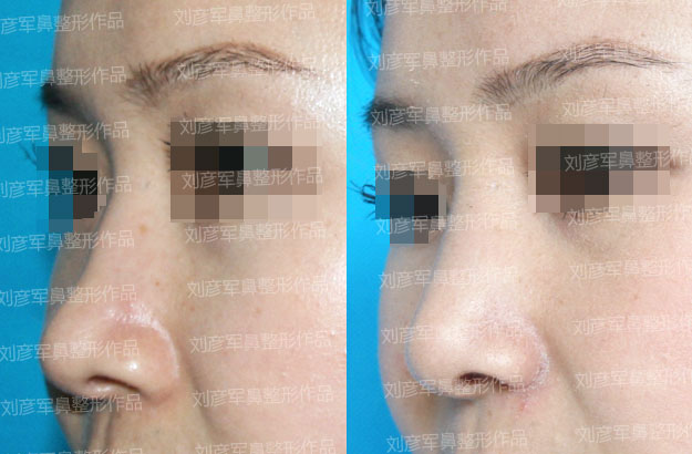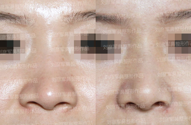 术前检查:鼻根低平、轻度、鼻尖低平且偏斜、鼻翼肥大
